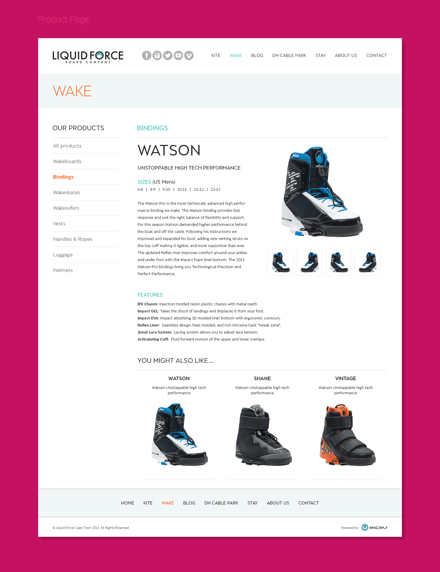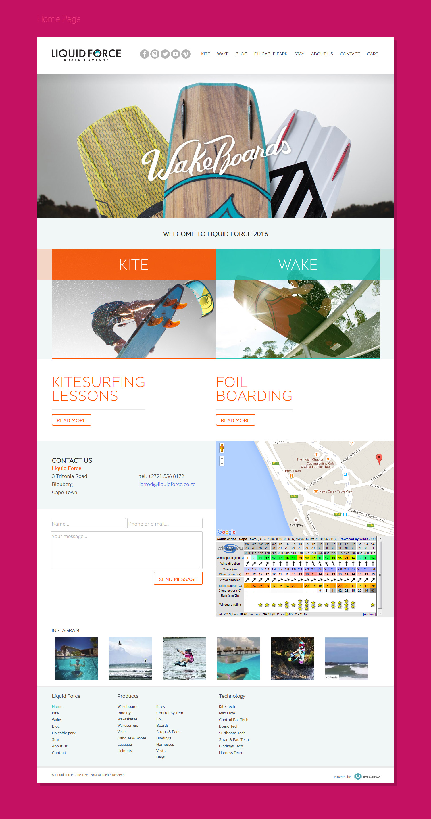 Dla firmy Liquid Force Cape Town stworzyliśmy sklep internetowy. Wykonaliśmy projekt graficzny i wdrożyliśmy go w oparciu o platformę WordPress WooCommerce. Bogata oferta produktów połączona jest z ofertą lekcji nauki kiteboardingu i wakeboardingu.