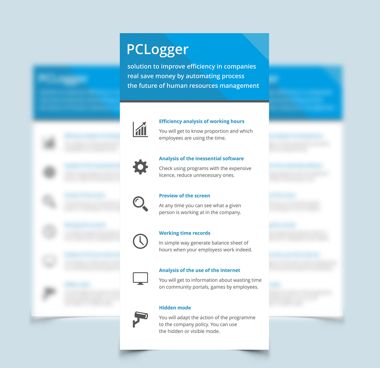 Ulotka, zawierająca opis możliwości aplikacji PC Logger, która służy do monitorowania efektywności pracy wykonywanej na komputerze.